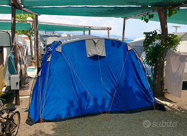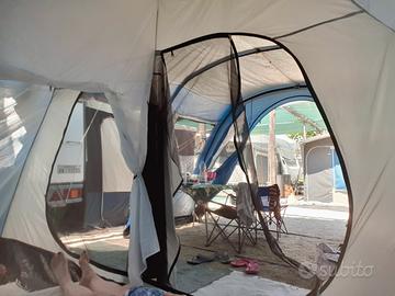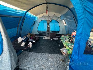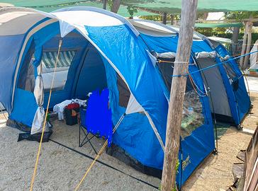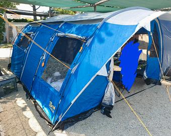 Tenda Bertoni COMET 6 a tunnel da 6 posti, nuova usata solo 3 volte, completa di sacca da trasporto, paleria in fibra e picchetti. Molto grande e spaziosa: 6x4 m e altezza interna max 210 cm. 2 camere separate, 2 aperture laterali oltre all'entrata frontale. Una parete può essere posizionata all'estremità come in foto oppure ad un terzo, con cerniere, creando una veranda.