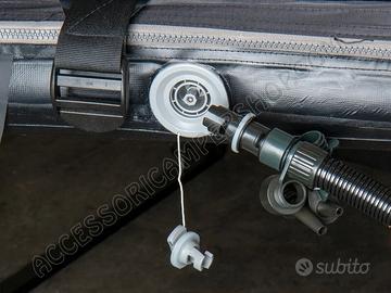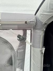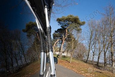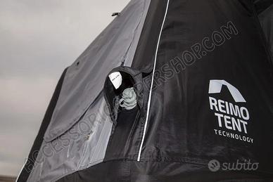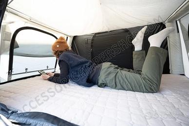 La nuova tenda da tetto ad aria BENDIGO AIR REIMO viene fornita completa di una piattaforma in alluminio. Questa viene montata sul veicolo in modo che il materasso gonfiato possa essere tirato nella guida della piattaforma utilizzando le tubazioni. La pelle della tenda è fissata al materasso e può essere gonfiata con la pompa in dotazione. L'operazione è molto rapida grazie al sistema di gonfiaggio a un punto. La scala viene quindi fissata in posizione e la tenda da tetto è pronta per l'uso. Lo sgonfiaggio è molto rapido grazie alle 2 valvole e la tenda e il materassino gonfiato possono rimanere sulla piattaforma e sono protetti da un telo durante il viaggio. La tenda da tetto e il materassino possono essere rimossi rapidamente e facilmente dalla piattaforma e riposti nella borsa di trasporto (circa 90 x 55 x 43 cm), consentendo di scegliere se lasciare la tenda da tetto sul tetto durante la guida o se riporla nel veicolo. Tutte le finestre e le porte sono dotate di zanzariere e di un tettuccio che può essere montato rapidamente. Il tettuccio interno in dotazione offre maggiore comfort, copre la struttura del tetto e riduce la condensa. È incluso anche un morbido coprimaterasso per un comfort ancora maggiore. Agli angoli della tenda da tetto sono presenti dei passanti per il tensionamento. La tenda da tetto può essere utilizzata anche senza piattaforma e con il veicolo a terra.