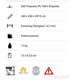 Accessori di serie: telo esterno, paleria, asta aprichiusa, corde di tensione, picchetti, sacca custodia