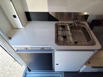 Accesori: Grande porta d'entrata posteriore, Pareti e tetto in vetroresin, Dinette trasormabile in grande letto 187×190 c, Frigorifero 70,Fornello 2 fuochi in acciaio inox + lavello, .Serbatoio di acqua pulita 45 L, Boiler Acqua Calda, Tendalino e PopUp.