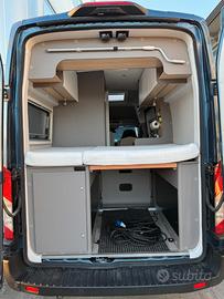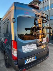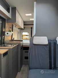 Cucina con due fuochi gas cottura, frigorifero a compressore Dometic, riscaldamento Truma Combi 4, scalino estraibile elettrico, tendaline thule Omnistor, portabici.