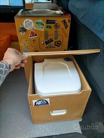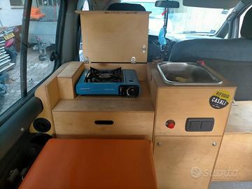 - Piano cottura con fornellino a gas (bombolette) con al di sotto dispensa per riporre stoviglie, padelle e cibo;