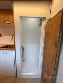 Bagno con piatto doccia 60x80 cm e WC compostabile Separett Tiny estraibile.