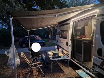 Pack Accessori: tendalino esterno, pannello solare 150 watt, batteria cellula maggiorata, luce esterna led, zanzariera portellone scorrevole, zanzariera portellone posteriore, oscuranti cabina plissettati, terzo letto per cabina, cornici finestrini posteriori, scalino elettrico, porta bici due posti, antifurto volumetrico e perimetrale; ruota di scorta sotto il pianale.