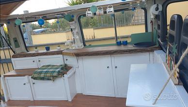 rifatto tutto l'impianto elettrico, aggiunti fanali supplementari, gomme da carico, ruota di scorta sotto il pianale, impianto multimediale nuovo, doppia batteria, panello fotovoltaico, sistema elettrico con mille interruttori per staccare batterie, mandarle in parallelo oppure solo motore e servizi separati, luci supplementari interne per illuminare l'esterno su tutti i lati, pompa acqua con taniche acque chiare e acque grigie, riscaldamento interno a bioetanolo, ventilatore dinette, prese usb, tanti vani porta oggetti, migliaia di euro spesi in cuscineria fatta con tessuto da esterno, sistema di apertura tetto, tavolo regolabile, portapacchi da tetto, scaletta esterna, frigorifero elettrico a 12 o a 220v , bagno chimico nascosto, gli spazi sono stati calcolati per poter caricare uno scooter all'interno fra le sedute, tenda esterna e mille altri accessori.