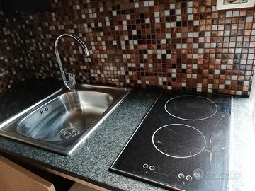 Cucina con frigo, piastre ad induzione, lavabo e pensileria.