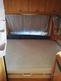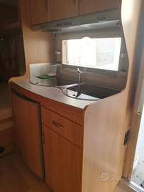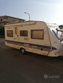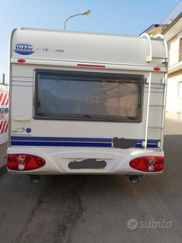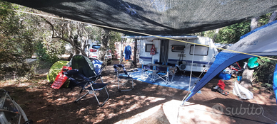 Vendesi roulotte marca Hobby modello Excellent Early Easy 450 immatricolata il 9.05.2006, 4 posti, sempre rimessata al coperto, con documenti. Letto matrimoniale fisso anteriore e dinette posteriore a ferro di cavallo per 4 persone trasformabile in altro ampio letto matrimoniale per due. Blocco cucina centrale con frigorifero da 85 litri e vano congelatore interno, lavello in acciaio inox e fornello a gas tre fuochi con copertura in vetro temperato, frigo esterno + congelatore, serbatoio acqua pulita da 100 litri, bagno con toilette a cassetta e wc chimico portatile, lavabo e doccia, stufa Truma, tetto calpestabile e scala posteriore, grande oblò sul tetto, antenna TV allungabile sul tetto con predisposizione interna TV, tendalino con argano Omnistore 5002, zanzariere e tendine oscuranti interne, portabici anteriore per due stall,i tutto perfettamente funzionante. Sono compresi nel prezzo vari accessori ed attrezzature da campeggio. Lunghezza m. 6.38, larghezza m. 2,20. Massa max ammessa kg. 1200. La roulotte è ben tenuta, senza infiltrazioni ed è visionabile in Puglia presso il rimessaggio del Riva di Ugento Camping Resort. Euro 8.000,00 trattabili (poco), no perditempo.