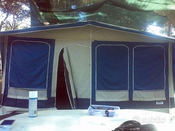 Pareti laterali amovibili con porta in tessuto poliestere resinato e zanzariera, finestre a due strati (zanzariera+oscurante) incernierati