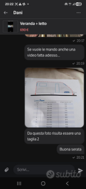 Vendo Veranda in ottimo stato completa di paleria e tendine marca Nova aprica 4 taglia 2*( totale lunghezza del cordino fino a terra è di metri 7 e30 con ampliamento per letto matrimoniale del 2019, comprensivo di letto matrimoniale a 2 reti singoli unibili del valore di €220, come da foto + materasso memory foam marca Sultan sfoderabile del valore di €550, acquistati entrambi da Ikea 5 anni fa. La misura della veranda si adatta per una roulotte di metri 3,60 + 2.00 di veranda aggiuntiva integrabile(inclusa) totale metri 5,60 ( solo il prolungamento, che è stato realizzato su misura, è costato €700), usata solo 15 giorni l'anno. Riposta nelle sacche originali, visibile a Roma. Se può interessare posso inviare altre foto o video su messenger. Pregi: Non ha nessuna infiltrazione ed è ben conservata e pulita. Difetto: Da rivedere un asola (cordino di stoffa) per trattenere la porta d'ingresso una volta arrotolata. Costo €490 (SE SOLO VERANDA €390). Solo se interessati. Contattare al 327-7374936, Gianni Russotto