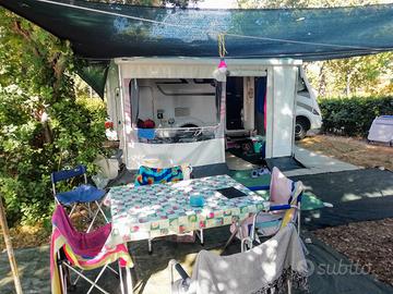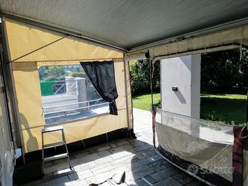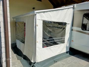 Bellissima ed indistruttibile veranda per Camper, adatta a tendalino Omnistor L. 2,75 con estensione a L. 3,25 x prof. 2,30 e altezza regolabile h. 2,30÷2,60, completa di paleria, aperture e tende. Molto robusta in qualto l'aggancio sul tendalino è a pinzare e perfettamente impermeabile, in ottimo stato, con borsoni di stoccaggio.