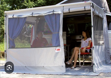 Vendesi veranda privacy room della fiamma per tendalino f45i e similari come da foto comprensivo di zanzariere nelle finestre laterali e rispettive tende su tutte le parti finestrate.