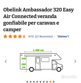 Vendo veranda gonfiabile Obelink Ambassador 320 Easy Air Connected nuova per misure errate del camper essendo un camper per disabili la porta d'ingresso è più grande e sotto scorre la pedana per la carrozzina. La porta deve essere aperta totalmente e questo mi impedisce di montare la veranda. Prezzo di vendita nuovo 750 euro . Ripeto è nuova lo aperta solamente per provarla con esito negativo.