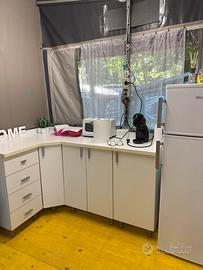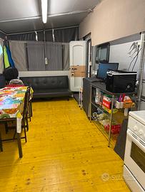 Vendo vertend Crippa completamente pavimentata rialzata da terra con struttura in ferro, completa di impianto luci neon e prese, rifinita all'interno di pannelli in legno, con frigo e mobili cucina con fornello e forno, tavolo in vetro e ferro battuto con 4 sedie, più veranda esterna Brembo con teli scorrevoli più piccoli ripostiglio per utensili