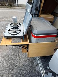 Piano cucina interno su misura amovibile con due fuochi, predisposto per cucinare anche lateralmente in esterno