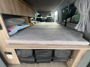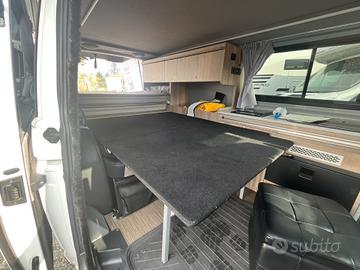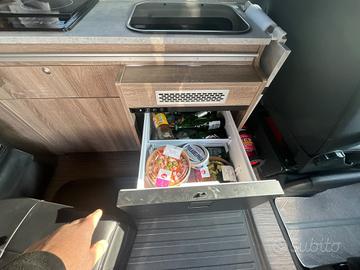 Il camper più compatto in circolazione con panca trasformabile in letto e tetto sollevabile con letto matrimoniale. Lunga la parete di sx troviamo il blocco cucina con lavandino e frigorifero a compressore oltre a spazio per lo stivaggio dei nostri indumenti .