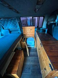 Camperizzazione homemade completa di letto posteriore con cassettoni estraibili, armadi anteriori con bellissimo lavandino in ceramica, tavolino estraibile, postazione a scomparsa per porta-potti. Grossi vani estraibili posteriormante disposti sotto a letto.