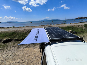 Sistema con telaio su misura per VW T4, pannello inclinabile, fornito di veranda, 375 watt, pronto all uso. Struttura in alluminio e inox
