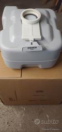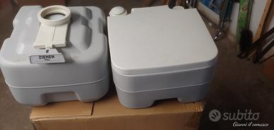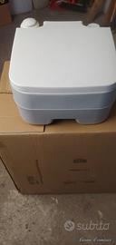 vendo w c. chimico portatile per roulotte o camper. Acquistato l' anno scorso e usato per 20 giorni circa. Composto da due pezzi agganciabile. La parte inferiore per la raccolta escrementi e per lo svuotamento. La parte superiore per il serbatoio dell'acqua per lo sciacquone con relativa pompetta. Peso complessivo a vuoto kg 5,2 Misure altezza cm 46 - larghezza cm 36 - profondità cm 43. Prezzo di vendita 40€ + spese di spedizione 10€.