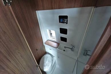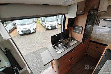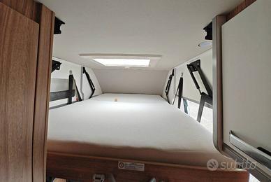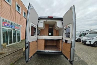 Van con letto matrimoniale trasversale posteriore e sottostante gavone, bagno con doccia e cucina con frigo da 95 l nella zona centrale, semidinette con sedili anteriori girevoli e letto basculante matrimoniale longitudinale.