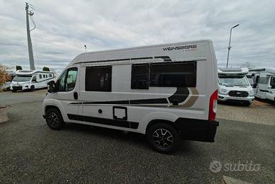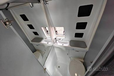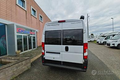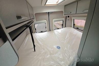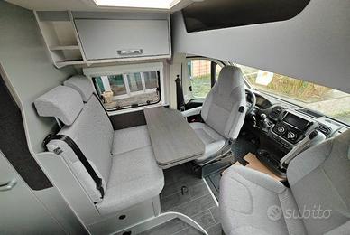 Van con semidinette completata dai sedili girevoli in cabina nella zona anteriore, cucina con frigo a compressore da 75l e bagno nella zona centrale, letto matrimoniale posteriore con sottostante gavone.