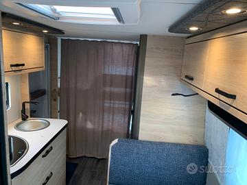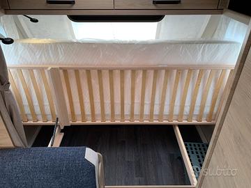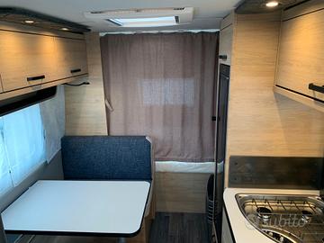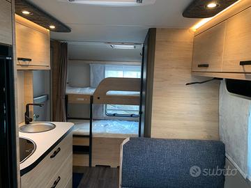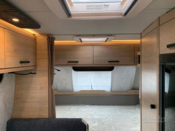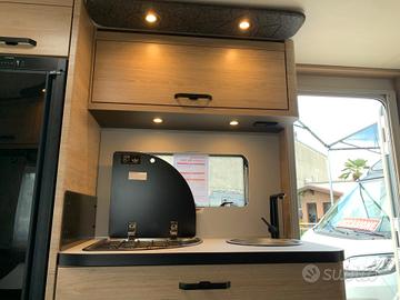 Dotazione:Tetto in vetroresina antigrandine, porta d'ingresso da 60 cm, riscaldamento 3000 calorie, pareti anticondensa, reti a doghe, materasso pregiato.Pacchetto Exterieur: cerchi in lega, pareti laterali in lamiera liscia bianche, copri timone.Pacchetto Convenience: piedini di stazionamento rinforzati, giunto di sicurezza stabilizzatore, termoventilazione, zanzariera porta d'ingresso, oscuranti e zanzariere su tutte le aperture.Pacchetto Feel Good: boiler, serbatoio acque chiare da 45 litri, impianto doccia bagno, miscelatore doccia con supporto e tenda doccia.Fascia di luci a LED sui pensili, guardaroba, 2 luci per la notte con interruttore, moquette, tappezzeria DUSK.