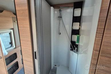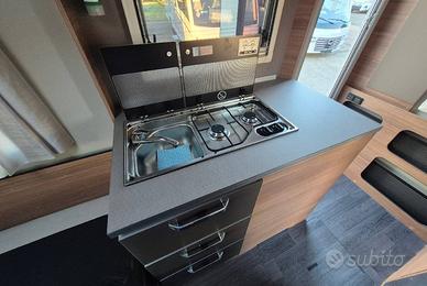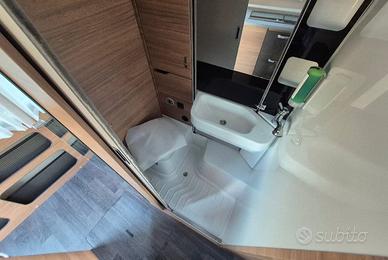 Semintegrale compatto con letto matrimoniale basculante anteriore con sottostante dinette face to face trasformabile in letto matrimoniale, bagno vario, cucina con frigo 90 l e gavone posteriore con accesso sia dall'esterno che dall'interno.