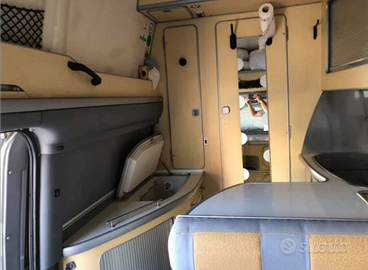 In coda bagno con lavandino, doccia e stendi abiti. Gavone di stivaggio posteriore sotto il bagno con un corridoio che si estende sotto il pavimento della cucina fino alla porte scorrevole laterale. Doppia cassetta wc. Moquette originale Westfalia in tutto il camper. Cassaforte originale Westfalia. Luci interne a led. Oscurante e zanzariera nuova in dinette.