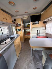 Tendalino, Toiletta, Letti singoli, Letto matrimoniale basculante, tv con digitale terrestre, pannello fotovoltaico, allarme su tutte le porte compresi i gavoni, porta moto posteriore, telecamera posteriore, scambiatore bombole gas automatico truma, navigatore satellitare, bluetoot telefono. sospensioni Alko. Riscaldamento truma 6000. Inverter. ecc.