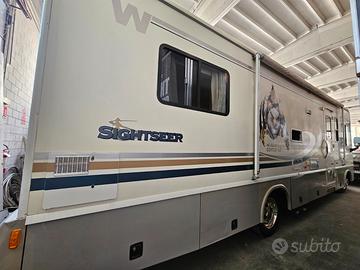 Motorhome americano Winnebago Sightseer 30b, 9 metri e mezzo, accessori come da standard americano, generatore, frigo, microonde, clima, antenna Glomex, una slide apribile sul living.