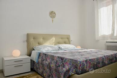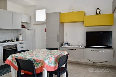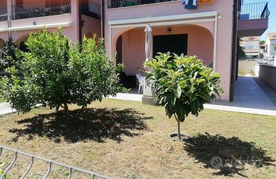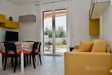 Nuovo appartamento bilocale 4 posti con ampio giardino recintato e posto auto privato coperto. Offre ampia zona giorno con divano letto matrimoniale, angolo cottura attrezzato, camera matrimoniale, bagno con box doccia. Dotato di aria condizionata, lavatrice, frigo con congelatore, fornelli 4 fuochi, forno elettrico, lavastoviglie, tv. Piscina condominiale a disposizione. Distanza dal mare e dal centro 1 km. Questa è una soluzione Pet friendly: cortesemente Vi preghiamo di essere rispettosi degli arredi, di volervi dotare di teli divano se il vostro cane é abituato a salirvi, lasciare pulito il giardino e non arrecare disturbo ai vicini. Check in a partire dalle ore 16.00 e fino alle ore 19.30 Check out ore 09.00