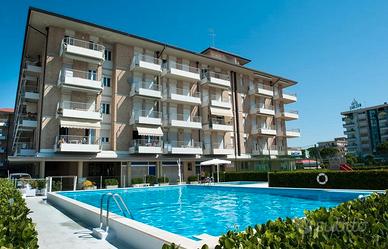 APPARTAMENTO DISPONIBILE NEI PERIODI: sabato 2 MAGGIO - sabato 30 MAGGIO sabato 11 LUGLIO- sab. 1 AGOSTO sabato 15 AGOSTO- sab. 29 AGOSTO sabato 29 AGOSTO- sab. 12 SETTEMBRE ZETA "ROYAL" - Frontemare con piscina Appartamento con le caratteristiche di una "Junior Suite", sito al condominio "ZETA RESIDENCE" di Jesolo frontemare con piscina, a pochi passi da p.zza Milano, dotato di spiaggia privata con 2 piscine, una per adulti ed altra per bambini. Appartamento con una splendida vista frontemare, sito al 3° piano con ascensore. Il suddetto immobile è stato ristrutturato completamente con un nuovo impianto di climatizzazione, calda e fredda, con split a soffitto, sia in camera da letto che nel soggiorno, coibentazione completa di tutte le pareti e dei soffitti, tali da rendere l'APE di classe B; nuovo ed elegante arredamento accessoriato con piano induzione, lavastoviglie, forno elettrico, microonde, TV color e divano letto per una persona in soggiorno, nonchè Tv color in camera da letto, cassaforte, mentre i pavimenti dell'appartamento sono in legno "Rovere". Il bagno con pavimento e pareti in ceramica, è dotato di lavatrice, phon automatico, specchio ingranditore, porta salviette elettrico, w.c, bidet e doccia a pavimento con ante apribili. La camera da letto dispone di un letto matrimoniale con 2 armadi a ponte, oltre all'installazione di un pannello divisorio in legno, ove è stata ricavata una nicchia con due letti bassi. La porta di ingresso è blindata e le pareti del soggiorno sono in tinta rasata. La tenda e le persiane sono elettriche, i serramenti in PVC con vetri antisfondamento. In realtà l'appartamento risulta insonorizzato e ci sono due terrazze, delle quali una fronte vista mare abitabile con tavolino e sedie, ed altra terrazza in camera da letto con vista laterale sul mare. Sono presenti 4/5 posti letto in totale, piscina, spiaggia privata, ascensore e parcheggio condominiale non esclusivo.