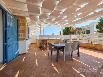 Elegante e ben rifinita villetta dotata di tutti i comfort, sita in località Marina di Mancaversa, in via Sirmione 5 a due passi da Gallipoli in un contesto residenziale tranquillo ideale per famiglie, la zona è tranquilla con i servizi vicini, tra cui Bar, Pizzerie e tabacchi, supermercato grande a 200m dalla casa. COMPOSIZIONE: La villetta celeste di circa 80mq, dispone di ampi spazi esterni ben disposti, con tegolato sul fronte per cene all'aperto, e sul retro attrezzati con barbecue, ove vi sono anche 2 docce esterne e area lavanderia. la casa ha: n° 3 camere da letto, (di cui 2 matrimoniali e una con letto alla francese di una piazza e mezza,) n° 2 servizi con doccia interni , 2 docce esterne, cucina open space con angolo cottura stile shabby chic, lavastoviglie e climatizzazione canalizzata Posto auto libero sulla strada. BIANCHERIA NON INCLUSA, su richiesta la si noleggia in loco ad € 20,00 per persona e comprende lenzuola e un tris di asciugamani. IT075085C200043675