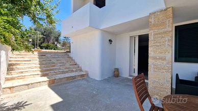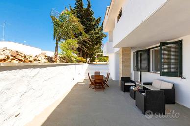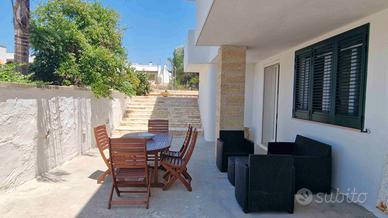Grazioso e ben curato appartamento, piano leggermente terra, all'interno di una villetta bifamiliare, con giardino e spazi esterni propri, posto nel cuore di Torre Suda , in via Orties, a 150m dai servizi, 200m dallo scoglio e 4km dalle spiagge di Gallipoli.