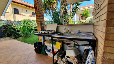No luglio no agosto Disponibile periodo primaverile e giugno All'interno del consorzio "La sbarra" a circa 400 m dal mare, piano terra con patio e giardino composto da: due camere matrimoniali, due camerette con letto a castello, soggiorno con angolo cottura, un bagno. Condizionatori in tutte le stanze, lavatrice, lavastoviglie Ampio spazio esterno con tavolo e divanetti. Barbecue e piccola cucina esterna. A due passi dalla Pineta dei Liberti dove si possono trovare bar, ristorante, piscina, campi da padel. Posizione strategica a 40km da Roma. A poca distanza da Zoomarine e a 15 minuti dalla riserva di Tor Caldara. Supermercato raggiungibile a piedi, spiaggia a 400 metri. Cin IT058117C2NRR9EIH