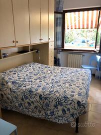 Ronchi, a 200 metri dal mare appartamento al piano terra con giardinetto e spazio esterno pranzabile composto da: ingresso su soggiorno, cucinotto, disimpegno, camera matrimoniale, camera doppia e bagno. Posto auto privato. Libero per il mese di luglio.