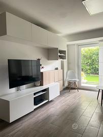 open space con divano letto (2 posti), cucina angolare con frigo, forno e microonde, bagno con doccia, camera matrimoniale, condizionatore, televisore e giardino con barbecue ottimo da utilizzare sia a pranzo che a cena in quanto ombreggiato.