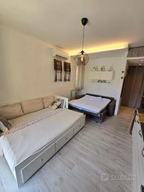 A san bartolomeo al mare,a 100 mt dal mare,monolocale al piano rialzato con ingresso indipendente da cancelletto privato e spazio esterno di proprietà. Vicinissimo a tutti i servizi che il paese offre ed alla nuova ciclabile.Dotato di aria condizionata Composto da ingresso ,bagno completo con wc,bidet,doccia,lavatrice/ zona giorno notte dotata di bancone zona colazione,parete attrezzata cucina con forno,microonde, frigor congelatore,fuochi a induzione, lavastoviglie, macchina caffè/ 2 divani letto totale max 4 posti. Wi-fi, cassaforte. Eventuale possibilità di box per ricovero biciclette o piccola auto. Parcheggi liberi nelle vicinanze Citra 008052lt0482 Disponibile per vacanze settimanali da pasqua in poi. No residenziale.