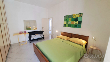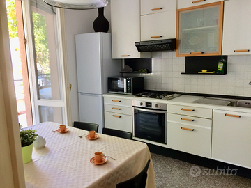 L'appartamento di 100 mq si trova ad un primo piano senza ascensore ed è molto adatto a famiglie numerose o gruppi di amici. L'immobile comprende: cucina abitabile, salotto con divano letto alla francese e TV, 3 camere da letto di cui due matrimoniali con letti con doghe in legno e una una doppia, 2 bagni (di cui uno con vasca e l'altro con doccia) ed enorme terrazzo che circonda la casa su tre lati. Altri servizi presenti nell'appartamento: Wi-Fi gratuito, lavastoviglie, forno, forno a microonde, frigo e freezer, 3 TV, lavatrice e stendini, phon, asse e ferro da stiro. Il quartiere Rivazzurra dove è localizzato l'appartamento è strategico, trovandosi a metà strada tra il centro di Rimini e il centro di Riccione, e offre ogni genere di comodità: dai bazar sul lungomare, ai ristoranti e negozi di quartiere nella parallela via principale di Rivazzurra. L'appartamento dista soli 6 km dall'uscita dell'autostrada Rimini Sud, 5,5 km dalla stazione di Rimini e 2 km da quella di Rimini Miramare. Si trova vicinissimo al parco Fiabilandia ed è ben servito dall'autobus che percorre il lungomare e dalla nuova metropolitana di Costa (metromare) che lo collegano alla stazione, ai poli fieristici e ai principali parchi tematici. Per info su disponibilità e prezzi puoi contattarmi al 3480137909.