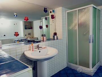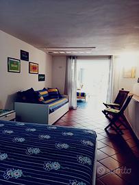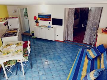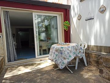 La casa vacanze presenta un pratico ingresso dal giardino ed attraverso una luminosa vetrata di accede alla zona living con divano ed angolo cottura. A seguire una camera matrimoniale e due letti singoli. Il bagno è completo di servizi wc, bidet, doccia, lavatoio e lavatrice. La TV a schermo piatto e l'ulteriore doccia esterna rappresentano una ulteriore praticità del soggiorno. Prezzo settimanale. Possibilità di sconto per soggiorni superiori alla settimana.