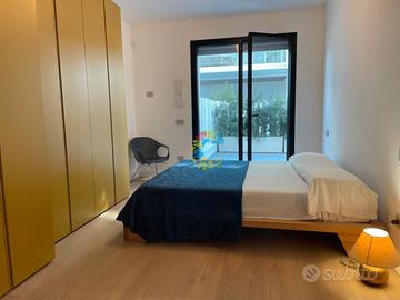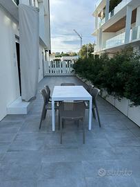 In un complesso residenziale nuovissimo ed elegante fronte mare, proponiamo un confortevole appartamento al piano terra con corte privata recintata e accesso diretto alla piscina condominiale. L'appartamento, climatizzato e arredato con gusto, è composto da: luminoso soggiorno con divano e angolo cottura dotato di piano a induzione e lavastoviglie, ampia camera matrimoniale con bagno privato completo di doccia, seconda camera con divano letto matrimoniale secondo bagno con doccia pratico ripostiglio/lavanderia con lavatrice. All'esterno, una spaziosa corte privata attrezzata con tavolo, sedie e ombrellone, ideale per momenti di relax all'aperto. Da qui si accede direttamente alla piscina tramite un cancelletto privato. Dotazioni e servizi: aria condizionata piscina condominiale posto auto scoperto assegnato all'esterno del condominio Posti letto: 4 Soluzione ideale per chi desidera una vacanza all'insegna del comfort, a pochi passi dal mare.