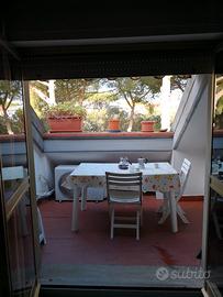 Libera ad agosto. Minimo 15 giorni. Inserita in contesto con molto verde. A 200 metri dal mare e comoda a tutti i servizi. Mansarda con camera con un letto matrimoniale e un letto singolo, cucina con angolo cottura con ampio divano letto matrimoniale, bagno con lavatrice. Doppia loggia/balcone, una comoda per mangiare e una adattata a lavatoio/stenditoio. Aria condizionata in entrambe le stanze. Recente ristrutturazione. A disposizione due biciclette.