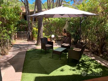 vialetto interno centralissimo con parcheggio privato residenti, villetta a schiera piano terra ristrutturata con 5 posti letto, composta da salone/sala da pranzo, 2 camere ( 1 matrimoniale e 1 con letto a castello, soggiorno con divano letto), zanzariere, angolo cottura con forno, macchina per il caffè a capsule, bagno con doccia, lavatrice, asciugacapelli, ferro da stiro, doccia esterna, giardino con patio scoperto e coperto, barbecue, impianto satellitare Sky, tv con digitale terrestre incorporato, aria condizionata, dotazione spiaggia (ombrelloni, lettini, sdrai) completamente arredato, periodi da aprile, maggio, giugno, luglio, agosto, settembre, ottobre, anche a settimana intesa da sabato a sabato, prezzi in base al periodo ( i prezzi si intendono compresi di consumi, lenzuola e asciugamani per 4 persone e spese di pulizia di uscita). A 10 minuti di macchina da Pula e dal sito archeologico di Nora, a 5 minuti di macchina dalle spiagge di Chia e a 10 minuti di macchina dalla spiaggia di Tuerredda. Vicinanza a ristoranti di Chia (Mirage, Bithia, Mr. Akumal) e Pula ( da Giancarlo, Eleonora, Zio Dino, Sa Macinera) market e negozi (centro commerciale "La Pineta", market La Cantoniera, Calaverde). È presente nel villaggio servizio bus da e verso Pula da maggio ad ottobre.