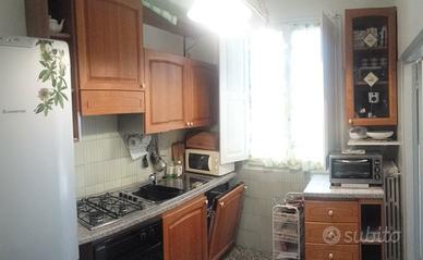 Appartamento uso vacanza in villa d'epoca. Piano terra, 5 vani con 3 camere da letto (1 con letto matrimoniale, una con letto singolo e letto a soppalco e 1 con letto a castello) soggiorno, cucina, bagno con doccia. Zona tranquilla, distanza dal mare 8 minuti a piedi. Completamente arredato e dotato di stoviglie complete, frigo, forno normale e a microonde con grill, lavatrice, lavastoviglie, ferro da stiro, Tv in soggiorno e in 2 camere da letto, tavolo allungabile ecc...Dehors con possibilità di mangiare all'aperto. Posto per un'auto (due su esplicita richiesta). Ampio giardino (dove vivono liberi due gatti dei proprietari e saltuariamente potrebbe esserci la nostra piccola cagnolina Chihuahua). Piscina fuori terra di 5,5x3 mt.(solo nei mesi estivi). Biancheria non fornita. Riscaldato e disponibile anche nei mesi invernali.