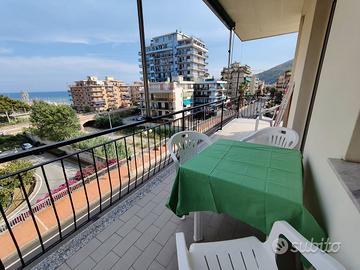 Composto da : ampio soggiorno con angolo cottura, 2 camere matrimoniali, bagno, terrazzo attrezzato con ombrellone, tavolo, sedie e sdraio prendisole. Tutti i locali hanno vista mare.