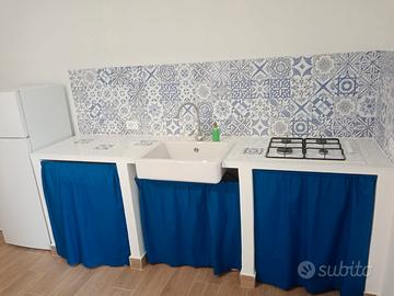 Cucina-soggiorno completamente attrezzata con piano cottura, frigorifero e zona pranzo.