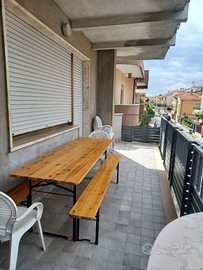 Tutta la zona giorno ha un lungo balcone unico con tavolo per 8/10 persone per mangiare all' aperto.