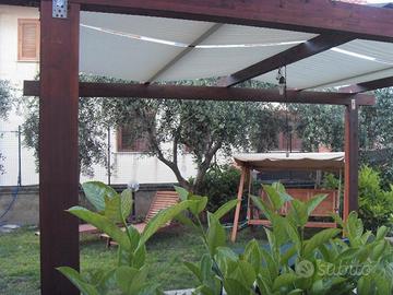 o Terrazzo attrezzato con tavolo, sedie e lavello, coperto da pergolato in legno
