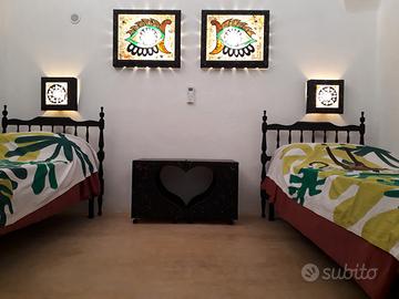 ART RESORT MONTALBANO si trova sulla SS16 fasano - ostuni ad angolo con Via vespri siciliani quasi di fronte all' Albergabici sede del Parco delle Dune Costiere. é un' antico casolare in tufo su due piani con le volte a botte diviso in tre appartamenti indipendenti ognuno con cucina attrezzata ,camera letto e bagno. Nello spazio antistante vi è un giardino con prato ,sedute e tavoli ,bbq,amache e zone ombreggiate.La struttura si propone di offrire un' esperienza sensoriale unica ed originale forse quasi terapeutica attraverso i colori , le opere d' arte, le lampade e gli oggetti di design che impreziosiscono questo spazio costruito con amore, dove rigenerarsi nell'arte immersi nella campagna pugliese a poca distanza dalle bellissime spiagge del Parco delle dune costiere. Tutti gli appartamenti hanno parcheggio riservato, aria condizionata , ventilatori a soffitto, acqua calda con pannelli solari. Al piano terra" TERRAGIALLA" è pervasa dalle tonalità calde e solari accentuate da lampade d'atmosfera e dalla forte presenza del legno , può ospitare 4 persone con 2 camere da letto, 2 bagni ,cucina completa con forno e ampio tavolo da pranzo. "TERRAROSSA" invece è dominata dal rosso sanguigno della campagna pugliese che dona una forte sensazione di energia e vitalità ,può ospitare fino a 3 persone con una camera letto, un divano letto cucina e bagno.(All'occorrenza i due appartamenti a piano terra possono diventare comunicanti portando a 7 posti la disponibilità totale). Al primo piano si trova "BLUOCEAN" che è una "stanza delle meraviglie" un tuffo nel blu in tutte le sue sfumature e regala la sensazione di essere immersi in un oceano guardando un cielo trapunto di stelle rese evidenti da particolari giochi di luce. Può ospitare fino a 3 persone con una camera letto ,un divano letto cucina e bagno . Al primo piano vi è anche un terrazzo solarium e lavanderia ad uso di tutti gli ospiti della struttura mentre nello spazio giardino si può visitare il laboratorio artistico