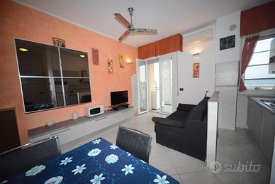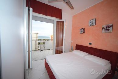 Affittiamo un grazioso e spazioso bilocale al quinto e ultimo piano di un condominio con ascensore, ideale per coppie o piccole famiglie. L'appartamento si compone di soggiorno con divano letto, TV e angolo cottura, camera matrimoniale, bagno e terrazzo fronte mare con vista suggestiva. Dotato di lavatrice, pale al soffitto e aria condizionata (facoltativa, con supplemento), garantisce comfort e relax durante il soggiorno.
