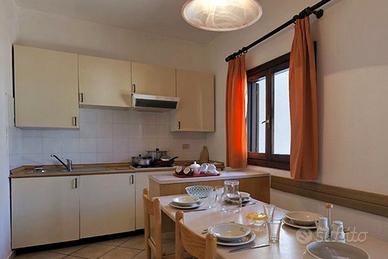 L'appartamento, completamente arredato e climatizzato, è ideale per un soggiorno vacanza rilassante, è situato al piano terra con accesso diretto ad un giardino adiacente ed è composto da una camera da letto matrimoniale, una cameretta con 2 letti a castello, un bagno con doccia ed un cucina-soggiorno, con divano letto per altri ulteriori 2 posti letto (35 ? extra/posto letto).